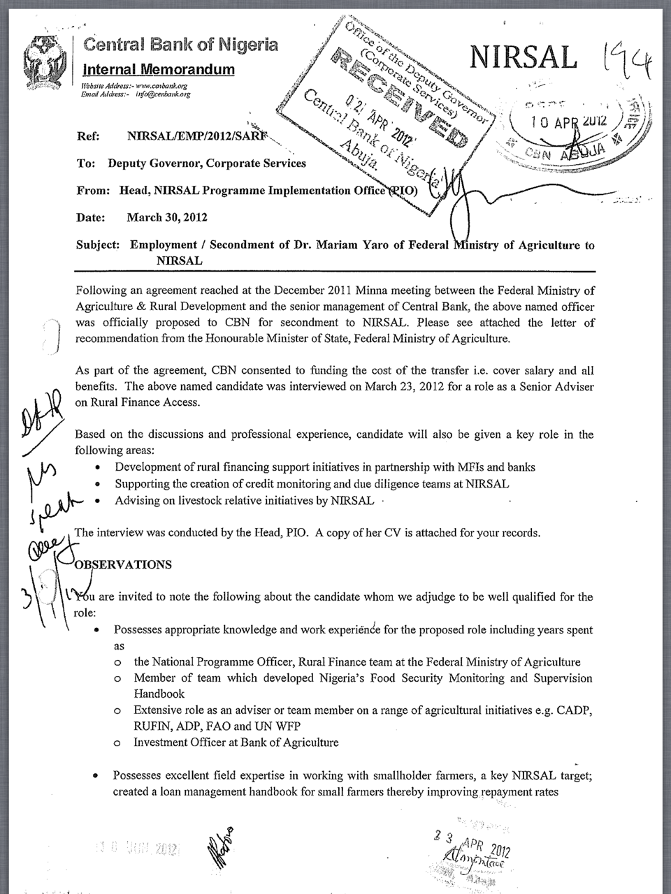 Documents for NIRSAL hiring Dr Maryam Yaro and Letter of Appointment for Dr Maryam Yaro
