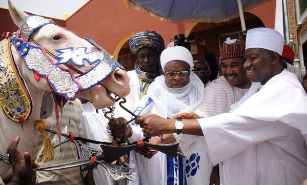 President Goodluck Ebele Johnathan is currently in Kastina for a two day visit. The Emir of Kastina gifted him with a horse ( I wonder where the Emir expects him to keep or ride it lol) seen in the picture above.